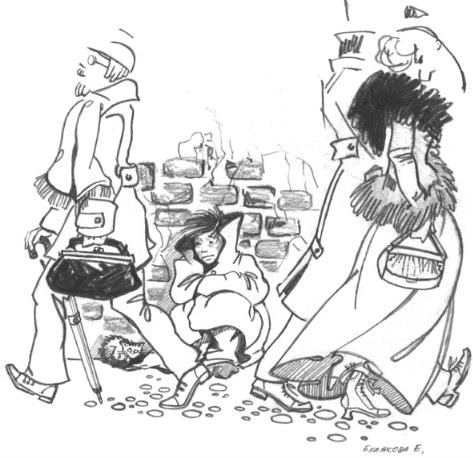 На зов выскочили из подвала еще двое, такие же бродяги. Один запасся даже поленом, что, разумеется, будь мальчик близко, не могло бы внушить ему доверия к их добрым намерениям. Глюпи Федька, кои гир!..