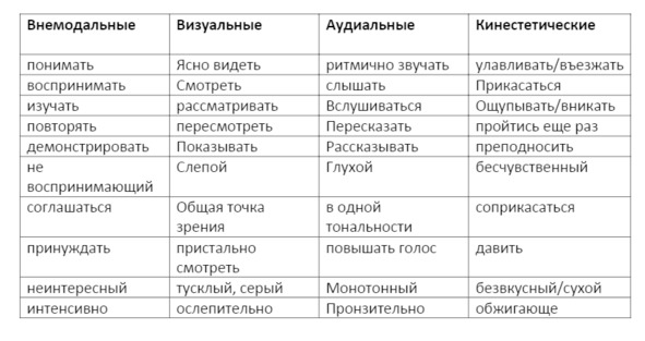 Неосознанно способы восприятия и хранения информации выражаются и в нашей речи, поэтому для коуча часто бывает важно учитывать и подстраиваться под них для установления раппорта. Вот некоторые примеры параллельных речевых выражений в разных репрезентативных системах: