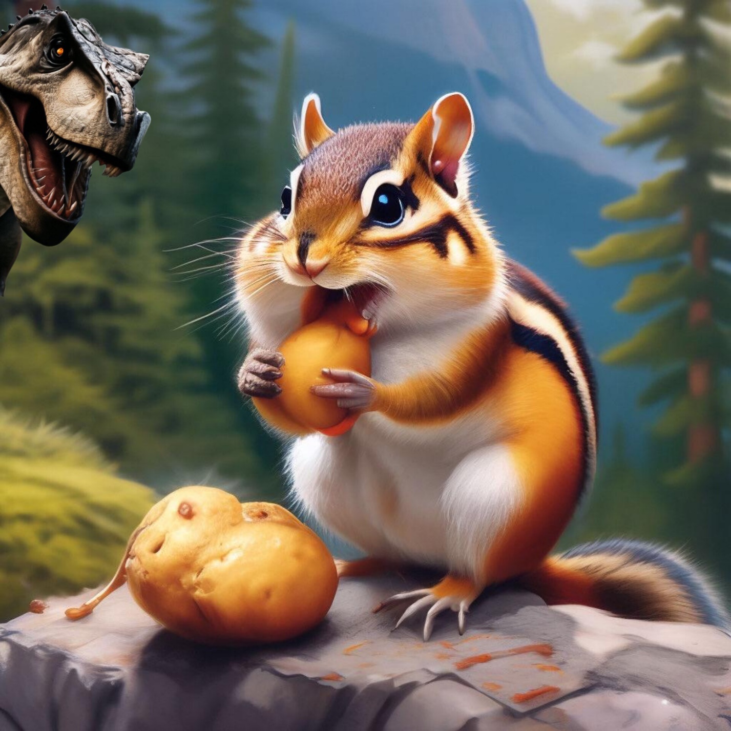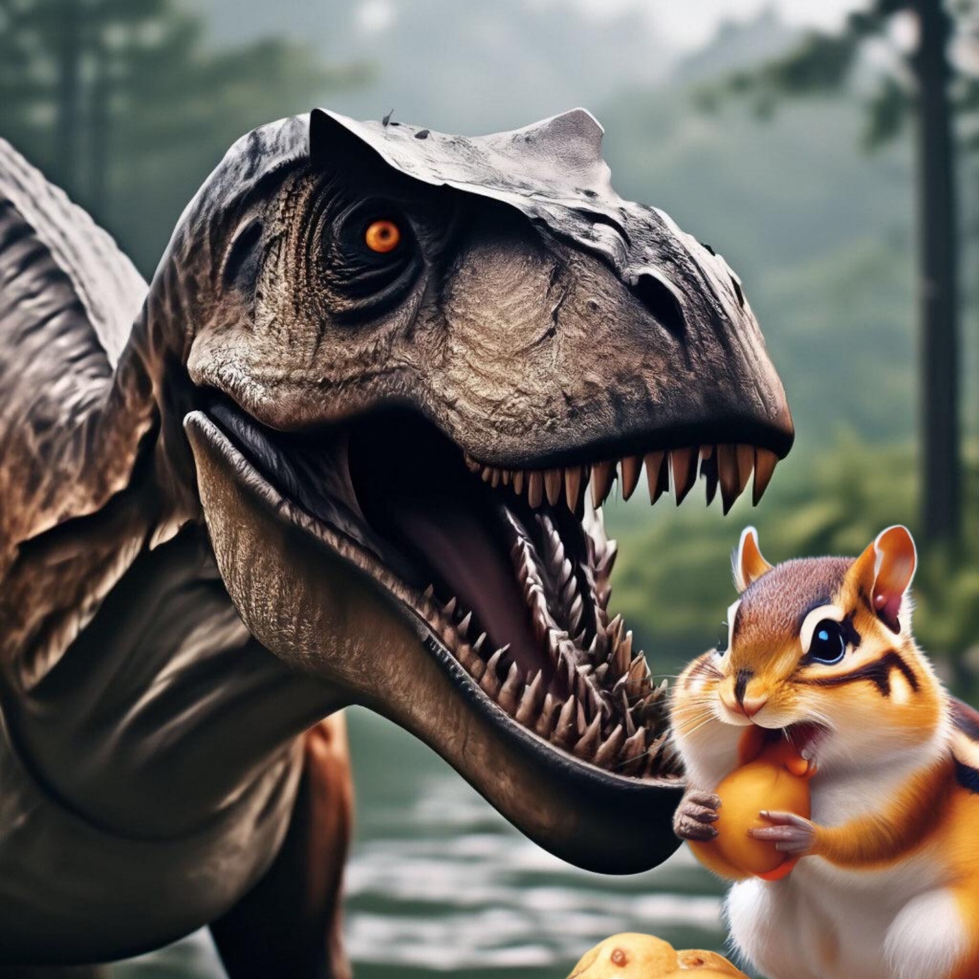 Тирекс был очень удивлен. Он решил зарычать снова. А бурундук, как ни в чем небывало, продолжил заниматься своими делами. Тогда динозавр приблизил свою морду так близко, что слегка задел плечо бурундучка.