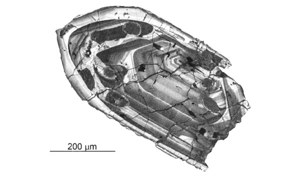 В неблагоприятных химических условиях кристаллы циркона начинают растворяться, но только лишь обстановка наладится, они снова приступают к самосборке, словно птица Феникс. Процесс этот исследован еще недостаточно. Как отмечает Т. В. Каулина (доктор геолого-минералогических наук, сотрудник Кольского научного центра РАН): «Практически нет работ, посвященных выявлению общих закономерностей образования и преобразования циркона в природе». Кроме того, нам почти ничего не известно о том, какова была химическая среда на протопланетной поверхности11. Среди архидревних кристаллов циркона попадаются экземпляры с «луковичным» строением, сердцевина которых окружена рядом более молодых слоев. При этом прослеживается закономерность чем ближе к центру минерала, тем богаче концентрация урана: кристаллы циркона частично растворялись, выпуская в «свободный полет» своих урановых и прочих «кукушат», входящих в кристаллическую решетку, а затем обрастали новыми, уже «очищенными» слоями (Рис. 2).