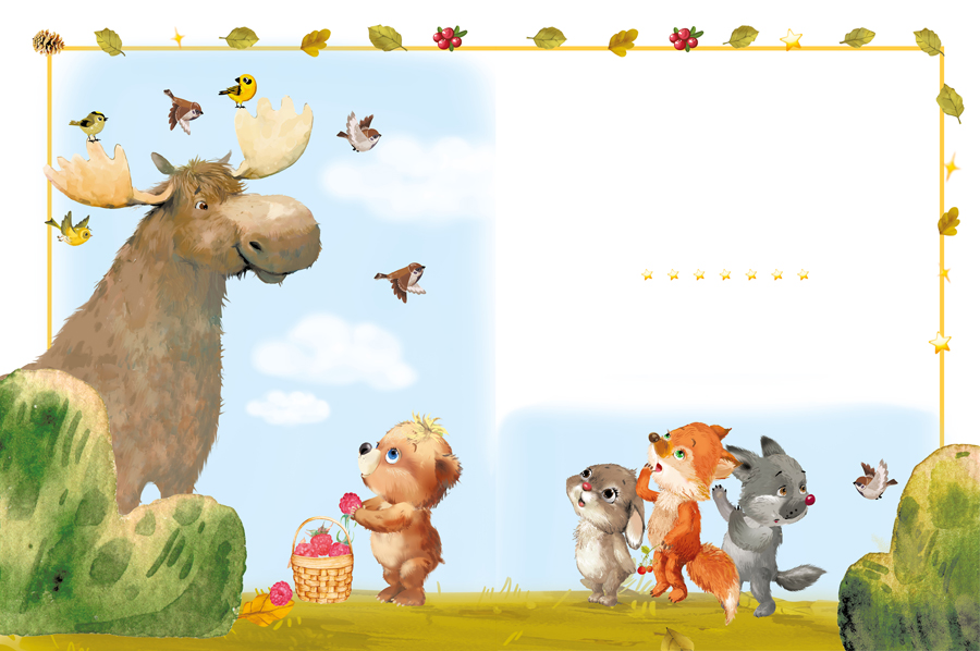 Медвежонок убежал и вскоре вернулся с корзиной малины. Лось наконец-то вышел из своего укрытия.