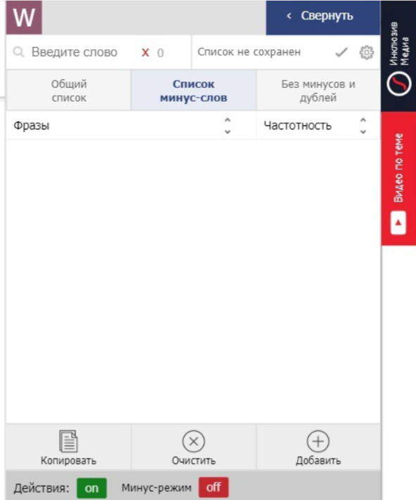 Так же есть плавающий блок, в котором хранятся ключевые фразы, минус слова и фразы без минусов: