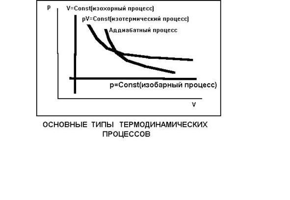 Основные типы термодинамических процессов и законы их определяющие: это изохорный, изобарный, изотермический и аддиабатный. Самым простым термодинамическим циклом, приближенным к реальным условиям является, например, цикл Карно.