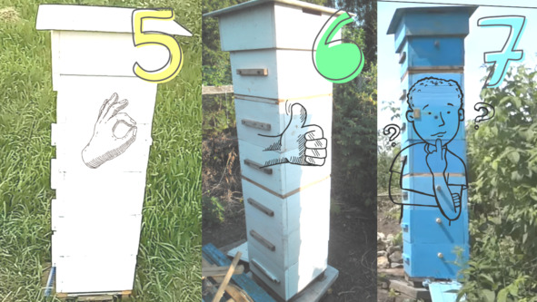 Стоит ли ставить больше шести корпусов? Наверное, нет. Снимать верхний корпус, весом 16 кг, даже рослому пчеловоду, физически сложно. Возможно, имеет смысл отобрать верхний корпус и установить сушь под медовую часть гнезда, на ближайший расплодный корпус.