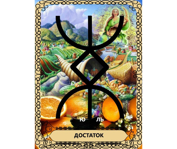 Русская руна Достаток является символом изобилия и достатка, имеет звуковое значение «Ю-ль». Руна Достаток была важным символом для славян, которые верили, что она привлекает к себе приток богатства и изобилия, ни только материального, но и духовного.