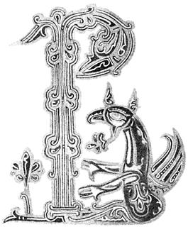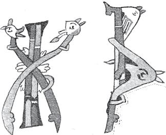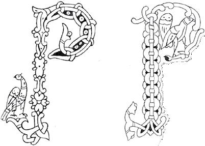 11. Превосходный документ, до убедительной очевидности свидетельствующий о переходе чисто византийского орнамента к сплетениям и чудовищам варварского или романского стиля, представляют нам заглавные буквы Юрьевского Евангелия 11201128 гг., составляющего в этом отношении в письменности новгородской, и по стилю, и по времени, связующее звено между памятниками XI в., Остромировым Евангелием и Григорием Богословом, и между рукописями XIV в., представляющими высшее развитие сплетенного орнамента. Из 65 заглавных букв Юрьевского Евангелия, которое по этому предмету в желаемой полноте исчерпано на трех таблицах, XIXXXI, издания г. Бутовского, до 20 букв принадлежат бесспорно к узорочьям из сплетенных животных и чудовищ, другие же представляют более или менее искусные копии с византийских оригиналов, как букв геометрического орнамента в архитектурной форме, например П (рис. 19), или же из листвы и ветвей, например Р (рис. 20), в виде пальмовой ветви с византийским завитком, которую держит рука, так и букв, хотя состоящих из животных, а иногда и из фигур человеческих, но, согласно византийскому стилю, не связанных переплетами ремней. Например (рис. 21), на выступе византийского лиственного завитка сидит птица или стоит животное, иногда (рис. 22) птица в овале, описываемом древесною ветвью, клюет ее листок; иногда (рис. 23) зверь стоит у столбика, образующего часть буквы, дополняя ее овалом своей фигуры. В одной букве (рис. 24) у столбика стоит конь, с чепраком на хребте; в другой (рис. 25) две человеческие фигуры, совсем в иконописном стиле, подошли к раке или саркофагу, стоящему на земле; напротив того, третья буква, именно Р (рис. 26), состоит из обнаженной человеческой же фигуры, держащей в руках ветвь с листьями и цветком, которая, образуя верхний овал буквы, опоясывает потом обнаженную фигуру и, завиваясь назад, спускается до ее ног византийским завитком. Из фигур, хотя тоже не сплетенных еще ремнями, замечательна как один из элементов переплетенного русского орнамента XIV в., царь-птица, т. е. по пояс человек в венце, а остальное птица с крыльями, хвостом и лапами. Такую фигуру встречаем в орнаменте XIV в. по изданию г. Бутовского на табл. XLII и XLV, но еще чаще вообще грифона или дракона с человеческою головою, с завитком на голове или же в остроконечной шапке. Царь-птица вошла и в прилепы Дмитриевского собора во Владимире, 1197 г.[16] Получеловек-полуптица фигурирует и в романском стиле на Западе, например, в буквах одной рукописи Лаонской библиотеки XII в.[17]; или же крылатое животное с человеческой головой в короне на одной капители[18].
