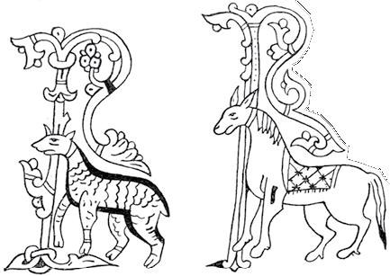 8. Чем небрежнее и беднее писаны украшения в византийских и южнославянских заглавных буквах, тем более теряют они в натуральности изображаемых предметов и тем более подчиняются условному стилю чудовищ, сплетающихся с змеями. Это особенно видно в украшениях, писанных чернилами или только одною какою-нибудь краскою, обыкновенно киноварью. В них роскошный орнамент византийских рукописей, копирующий мозаику и эмаль, переходит уже в затейливые узорочья каллиграфа.