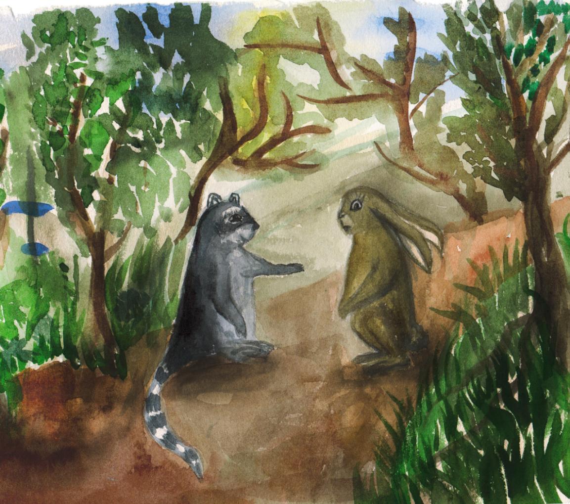 Встретил он в лесу Зайца. Поздоровался Енот с Зайцем и спрашивает: