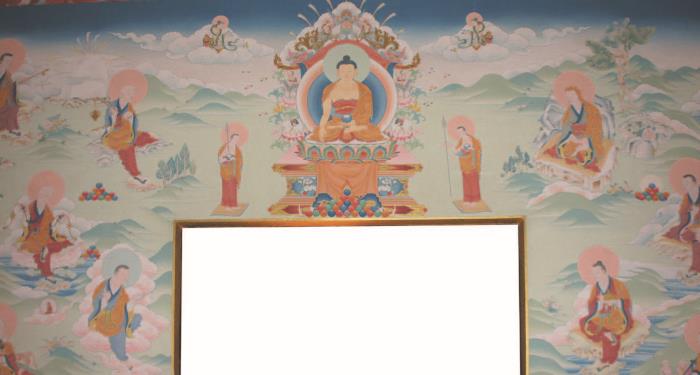 Будда Шакьямуни, окруженный архатами. Художник Дава Йолмо. Фреска в монастыре Шангпа Кагью, Лумбини, Непал. 2023