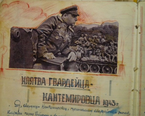 Я, гвардеец-кантемировец, принимая на свое боевое гвардейское знамя орден Красного Знамени, клянусь перед бойцами и офицерами моего корпуса, перед всей Красной Армией, моим народом и товарищем Сталиным ни словом, ни делом не опозорить омытое кровью, овеянное славою гвардейское Кантемировское краснознаменное боевое знамя.