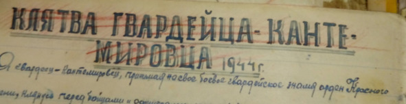 Я, гвардеец-кантемировец, принимая гвардейское знамя, клянусь перед бойцами и командирами моего корпуса, перед всей Красной Армией, моим народом и товарищем Сталиным ни словом, ни делом не опозорить омытое кровью, овеянное славою ГВАРДЕЙСКОЕ КАНТЕМИРОВСКОЕ БОЕВОЕ ЗНАМЯ.