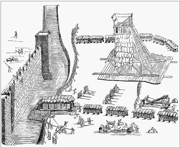 Осада городов в древности: крытые ходы, заслоны; машина, метавшая камни; башня для стрелков и для помещения тарана