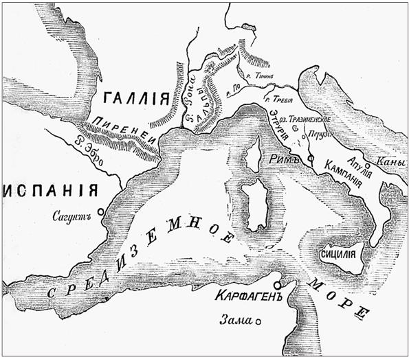 Но главный оплот Карфагена заключался в морских силах; они имели более 500 кораблей флот, равного которому не было в мире. В то время, когда римляне ничего не жалели для своего войска, разбогатевшие купцы Карфагена пререкались со своими военачальниками и торговались с ними из-за каждого гроша. И без того требовалось большое искусство, чтобы держать в порядке такое пестрое войско, которое находилось на службе Карфагена, чтобы приучить его к победам, но еще нужно уметь ладить с сенаторами жадными, завистливыми и скупыми купцами. Один из способнейших карфагенских военачальников, Гамилькар Барка, видел, что борьба с Римом не под силу его родному городу. Сицилия уже отошла к римлянам, многие острова Средиземного моря также; большие суммы денег ушли туда же. Тогда он предложил сенаторам перенести войну в Испанию, занять этот полуостров и, пользуясь его богатствами и соседством галлов, также ненавидевших римлян, вредить оттуда своим смертельным врагам. Сенат согласился, и в течение 9 лет Испанию завоевали. Здесь карфагеняне нашли выгодный сбыт своих товаров, нашли в изобилии серебро и по-прежнему богатели. Римляне позавидовали этим успехам и потребовали, чтобы Карфаген приостановил свои завоевания. Решили считать реку Эбро границей. Между тем, во время испанской войны, отличился своими необыкновенными дарованиями один из сыновей Гамилькара, по имени Анибал. В то время он получил отличное образование и в ранней молодости стал служить своему Отечеству. Рассказывают, что отец, отправляя первый раз в поход Анибала, подвел его к священному жертвеннику и заставил поклясться перед богами, что он останется навеки врагом Рима. Анибал сдержал эту клятву и никогда прежде, ни после, Рим не имел такого опасного противника, как этот полководец.