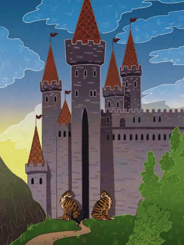 «Что же мне теперь делать» грустно подумала кошка, «Куда мне идти? В какой же стороне мой дом?» От безысходности своего положения она горько мяукнула. Но надо было как-то выбираться и искать обратную дорогу. Она посмотрела на высокую пушистую ель и спросила у неё: «Тётушка Ель, ты случайно не знаешь куда мне идти?» Но ель ничего ей не ответила. Тогда любопытная кошка сделала несколько шагов и остановилась у векового дуба. «Здравствуй, дядюшка Дуб, ты случайно не знаешь куда мне идти?» Но дядюшка Дуб только развёл своими старыми ветвями в разные стороны и покачал пушистой кроной. Кошка пошла дальше и средь кустов увидела еле заметную тропинку, она была такая крохотная, как будто по ней ходили лилипуты в незапамятные времена. Бодро перебирая лапками, кошка бежала по тропинке в надежде, что та приведёт ее домой. И какого же было её удивление, когда спустя некоторое время, перед ней появился звонкий журчащий ручеёк, а прям за ним огромный замок. Он был такой большой и могущественный, из серого старого камня, со множеством башенок, с подвесным мостом на цепях. А у больших полукруглых ворот замка неподвижно сидели настоящие тигры. Они были стражниками. «На мой дом это совершенно не похоже» подумала кошка, «это кого-то другого дом». Чей это может быть дом кошка додумать не успела потому, что стражники взревели в два своих горла таким свирепым рыком, что мост опрокинулся через ручей, приглашая кошку в замок.