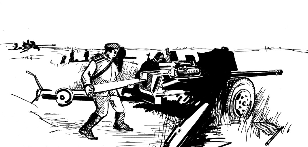 На третий день, после того как отстрелял первый и второй взвод, очередь дошла до взвода Николая. Рано утором прибыли на директрису. Она представляла собой большое поле, поросшее низкорослым кустарником. Впереди, метрах в пятидесяти, Николай заметил два красных флага, воткнутых в землю, на расстоянии, примерно, метров двести один от другого, а между ними четыре полуразвалившихся орудийных окопа. «Рубеж открытия огня» догадался он. Слева от того места, где стояли курсанты и чуть сзади, возле двухэтажного кирпичного здания, задрав стволы в небо, на площадке находились четыре орудия. Две пушки 57-мм ЗИС-2 образца 1941 года и две современные 100-мм противотанковые Т-12.