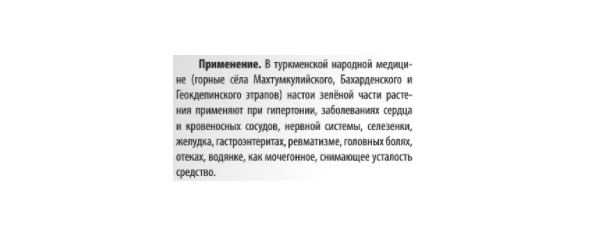 По [64]: лист, прием по 0.2 г, в день не более 0.8 г, равно по действию белладонне, судорожные и воспалительные страдания дыхательных, пищеварительных и мочеполовых органов. По [ВО]: семена антиглистное.