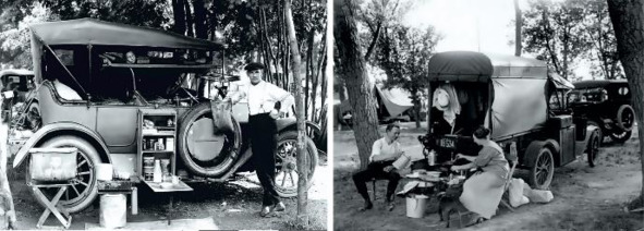 В это же время, на другом континенте, в Соединенных Штатах, производство автомобилей выходит на промышленный уровень, и к 20-м годам прошлого века появляются первые автомашины для путешествий. Автомобильный туризм становится настолько популярным в Америке, что про него начинают писать журналы. Этому явлению посвящают весь июльский номер журнала «Popular Science» («Популярная механика» 1920 г.). Тенденции караванинга в то время заключаются в том, что автомобильные путешественники брали с собой в дорогу много вещей, которые им не нужны. В принципе, прошло 100 лет, и ничего не изменилось с тех пор.