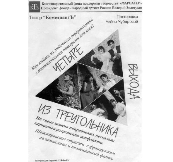 Алёна ЧубароваЭто случилось в то время, когда спектакли уже были, но театра, по сути, ещё не было. Была группа людей, которые хотели работать, но практически не имели для этого никаких условий. Ведь поставить спектакль полдела, главное где и для кого его играть. И вот мы получаем предложение. Если сделаем узбекскую сказку, нам дают сцену в небольшом узбекском кафе играть по выходным с оплатой под гарантию. А что ещё надо молодому творческому коллективу? Хоть какая-то стабильность и надёжность в море хаоса постсоветского пространства.