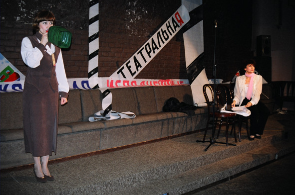 Хорошо помню выступление в Митино, на котором Хачатурьян своим преждевременным выходом на сцену произвёл потрясающий комический эффект. За кулисами у нас была форменная истерика. Потом была некоторая пауза (для меня), а в это время «КомедиантЪ» родил свою звёздную постановку о Маяковском в музее оного. Действие разворачивается непосредственно в музейных декорациях, публика вслед за актёрами от сцены к сцене перемещается по четырехэтажному зданию, наблюдая за жизнью поэта. Главную роль исполнил Геннадий Новиков потрясающий актёр, признавшийся как-то, что Маяковским он прежде не интересовался, ему всегда ближе был Лермонтов. Мне показалось, что он сам (кстати, так и назывался спектакль: «Он Сам») был удивлён неожиданной аутентичностью этой роли и вскрывшейся в нём «маяковскостью». Хотя не исключено, что это всего лишь мой домысел. Эта постановка поразила меня действительным, действенным разрушением границы между «сценой» и «залом», между актёрами и публикой я ощутил ту первоначальную, площадную театральную стихию, какой она, наверное, была в Средневековье. Оказалось, что это очень близко к моей творческой стратегии «воинствующей беззащитности» дистанция между актёрами и зрителями отсутствовала, физически отсутствовала, актеры невольно провоцировали зрителей на соучастие, что, вероятно, не раз приводило к импровизационным отклонениям от сценария. Я всегда воспринимал театр как «недо-кино», и этим он мне не нравился, а тут был сделан шаг назад, и дух первобытной, площадной, провоцирующей драматургии, атмосфера взаимозависимости актёра и зрителя оказались мне гораздо более внятны и близки.