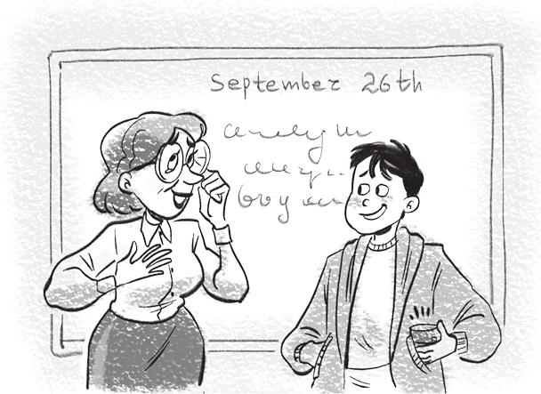 Что-то шепчет и прикрывает её тетрадкой на всякий случай.