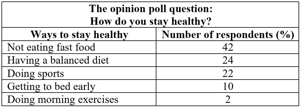 38.1 Imagine that you are doing a project on how people stay healthy in Zetland. You have found some data on the subject the results of the opinion polls (see the table below).