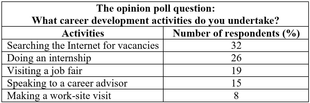38.1 Imagine that you are doing a project on what career development activities are popular among Zetland young people. You have found some data on the subject the results of the opinion polls (see the table below).