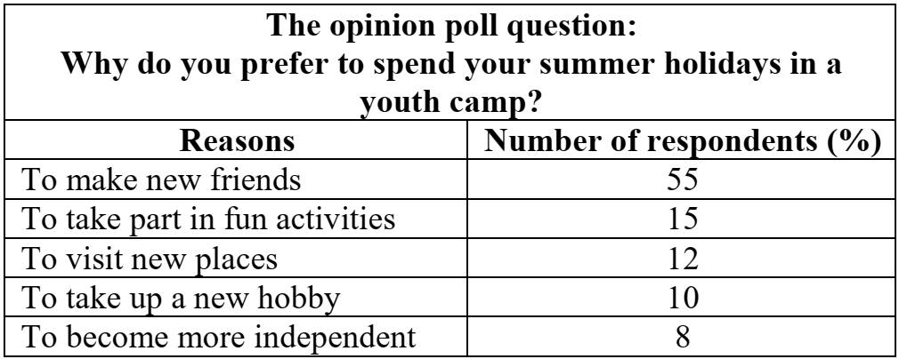 38.1 Imagine that you are doing a project on why many teenagers in Zetland prefer to spend their summer holidays in a youth camp. You have found some data on the subject the results of the opinion polls (see the table below).