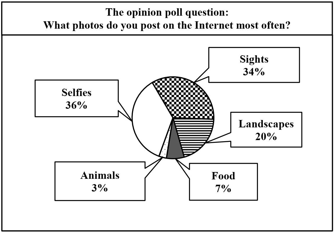 38.2 Imagine that you are doing a project on what photos teenagers in Zetland post on the Internet most often. You have found some data on the subject the results of the opinion polls (see the pie chart below).