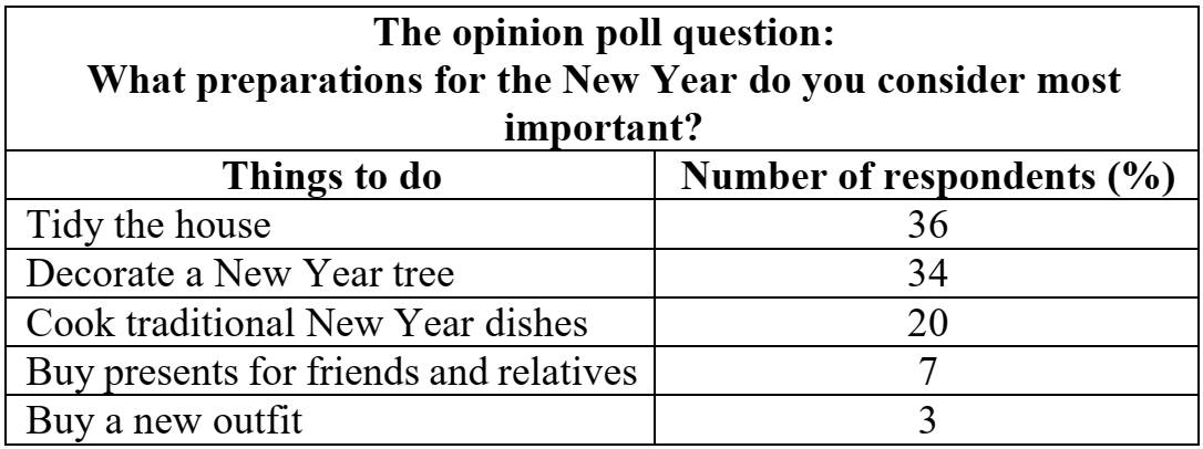 38.1 Imagine that you are doing a project on the preparations for the New Year that Zetlanders consider most important. You have found some data on the subject the results of the opinion polls (see the table below).