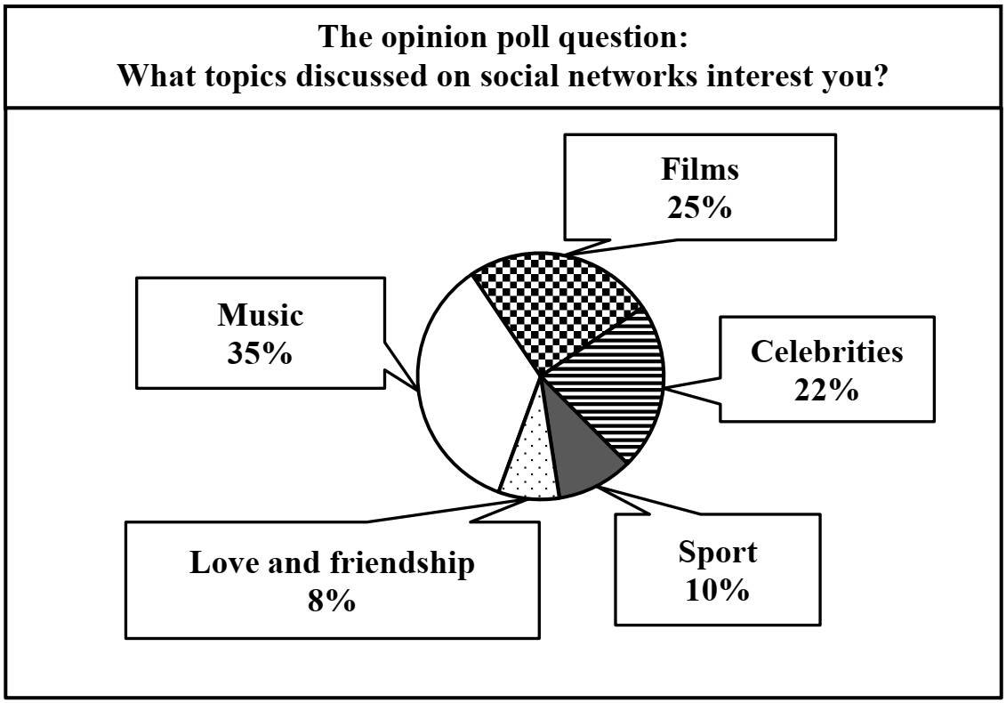 38.2 Imagine that you are doing a project on what topics discussed on social networks interest Zetland teenagers most of all. You have found some data on the subject the results of the opinion polls (see the pie chart below).