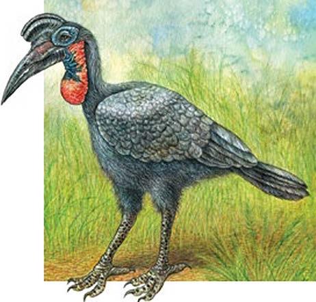 Крупная хищная птица из семейства птиц-носорогов. Название получила из-за большого клюва. Чёрное оперение и яркая красная кожа на лицевой части головы и шее. У самок шея голубая. Шлем, или рог, больше развит у самцов.