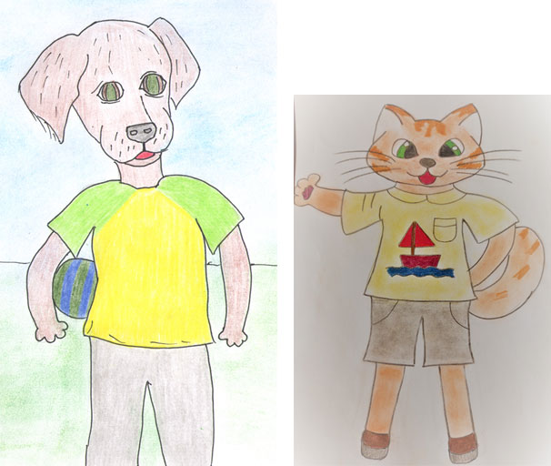 Так, размышляя, котёнок брёл по лужайке. Он не заметил, как натолкнулся на кого-то. Пушок поднял свои зелёные глаза и увидел двух забавных зверят: рыжего котёнка и коричневого щенка. Малыши с интересом смотрели на него.