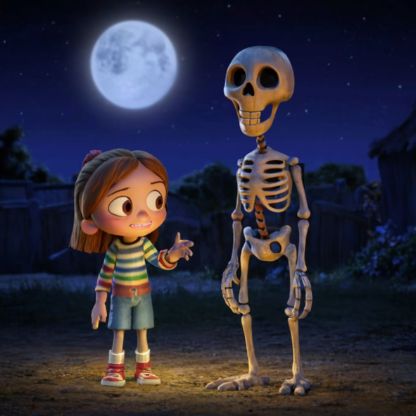 Frightening skeleton named Thiago emerged from the shadows, startling everyone around. People scattered in fear, their voices echoing through the night as they sought safety in the comforting glow of their homes. But amidst the chaos and panic, Sofia remained surprisingly unafraid, her curiosity piqued by the enigmatic figure before her.