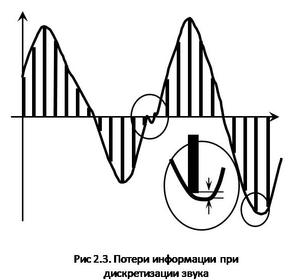 При цифровом способе хранения звука не сохраняется весь профиль кривой звукового давления (и соответственно, сопоставленного ему напряжения). На рис.3.4 проиллюстрированы потери информации об истинном изменении времени и значениях амплитуды.