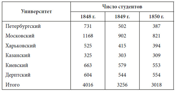 О численности студентов в университетах Российской империи в 18481850 годах дает представление следующая таблица.