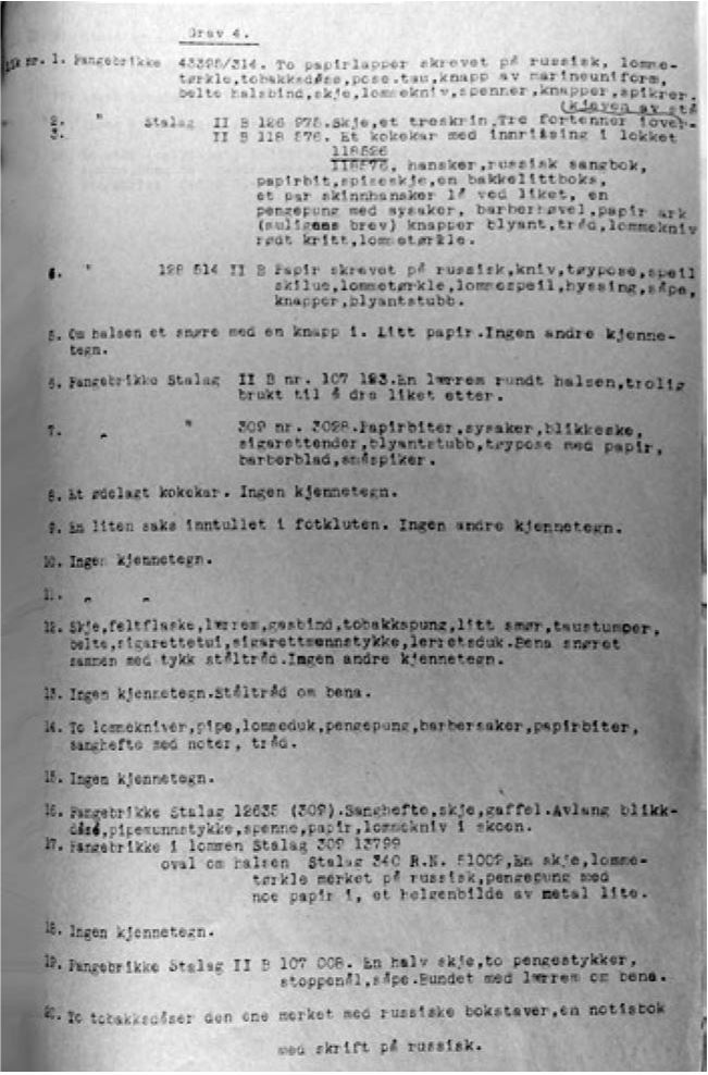 Единственное, что удалось найти констеблю Сигмунду Лей-гланду из Квесменеса в Лингене у погибших в Китдалене, это медальоны с указанием номера заключенного, они были у большинства из 104 жертв, найденных в большой могиле (могила 1). Он присутствовал в июне 1945 года при судебно-медицинской экспертизе погибших и сохранил личные вещи, такие как медальоны с номером заключенного и бумаги. Насколько это было возможно, он пытался распознать знаки, татуировки и русские слова с помощью переводчика. Работа шла с большим трудом, так как бумага часто оказывалась настолько истлевшей, что совершенно нельзя было понять, что там написано. Лейгланд также сохранил одежду, найденную в могиле 4, пропитанную, по его мнению, бензином64. Профессор Эйнар Шьовалл и его ассистент Магне Свендсен проделали нелегкую работу по исследованию останков 143 советских жертв из четырех могил в Квесменесе в Лингене спустя некоторое время после освобождения. В ходе этих исследований обнаружилось, какому жестокому обращению подвергались советские военнопленные. Английские и американские офицеры, принимавшие участие в этой операции, свидетельствовали после окончания работ, что они только слышали о таких преступлениях, но не верили, что это могло здесь произойти. В первой, самой большой могиле останки нашли на глубине 1,5 метров, головы были надежно прикрыты большими вязанками прутьев. Трупы забросали камнями и землей, а саму могилу прикрыли дерном65. В этой первой могиле нашли 96 человек. 79 из них умерли от голода, а 17 либо расстреляны, либо забиты до смерти. Большинство расстрелянных были убиты одним выстрелом. Стреляли в затылок, в висок, в шею или грудь, был один убитый выстрелом в спину и один убитый выстрелом в живот. Как правило, стреляли в упор, повреждения у жертв были настолько обширными, что позволяло с уверенностью предположить, что расстреливали из автоматов. У одного из расстрелянных головной убор был натянут на глаза, что позволяло предположить, что он был казнен. В другой могиле, где было найдено 12 человек, также присутствовали жертвы казни с натянутыми на глаза головными уборами. Один из найденных был убит выстрелом через левую руку и затем в голову через правую щеку. Похоже, что он заметил направленное на него оружие и попытался защитить голову рукой. Все жертвы из второй могилы погибли насильственной смертью. Теплая одежда свидетельствует о том, что все они работали на улице, дальнейшие исследования показали, что все они погибли вскоре после того, как оказались в лагере. В третьей могиле нашли двух человек. Врачи отметили, что один из них был похоронен в земле, другой лежал на земле под снегом. Один из погибших был полностью одет и убит двумя выстрелами в упор. Головной убор надет задом наперед и надвинут на глаза. Грудь раскрыта. В данном случае все указывало на совершение казни. Другой погибший также был расстрелян, но следов казни не обнаружено. Его застрелили в затылок, пуля прошла через голову. Из-за обширных повреждений эксперты заключили, что выстрел произведен из автомата. Вероятно, пленного оставили силы по пути на работу в горах, и он не мог держать темп колонны, поэтому немецкие конвоиры его застрелили. Эти смерти случились не одновременно, несмотря на то что оба были расстреляны и находились в лагере в одно и то же время. В четвертой могиле нашли 25 че