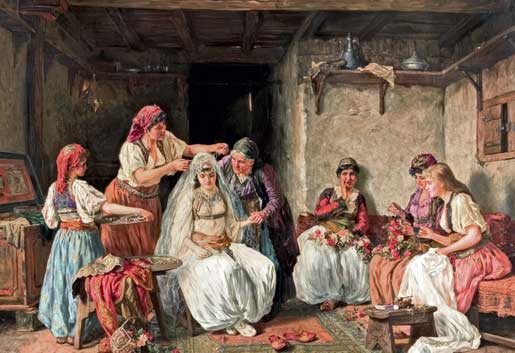 Жизнь ориентального города на Балканах отличалась богатством и роскошью. «Обряжение невесты». Художник П. Йованович, 1885/1886 г. Народный музей