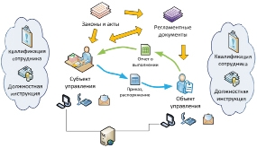 На Рис. 4 видно, что воздействие субъекта управления на объект управления осуществляется при помощи знания ими и умения применять в своей работе нормативнометодических и организационнораспорядительных документов, законов и актов, а также посредством непосредственной передачи указаний от руководителя исполнителю или от руководителя одного уровня руководителю того же или более низкого уровня, когда решаются определенные руководителем организации задачи, требующие такого подчинения, и получения обратной связи о выполнении порученной задачи исполнителем. Руководитель и исполнитель для выполнения своих обязанностей должны иметь: