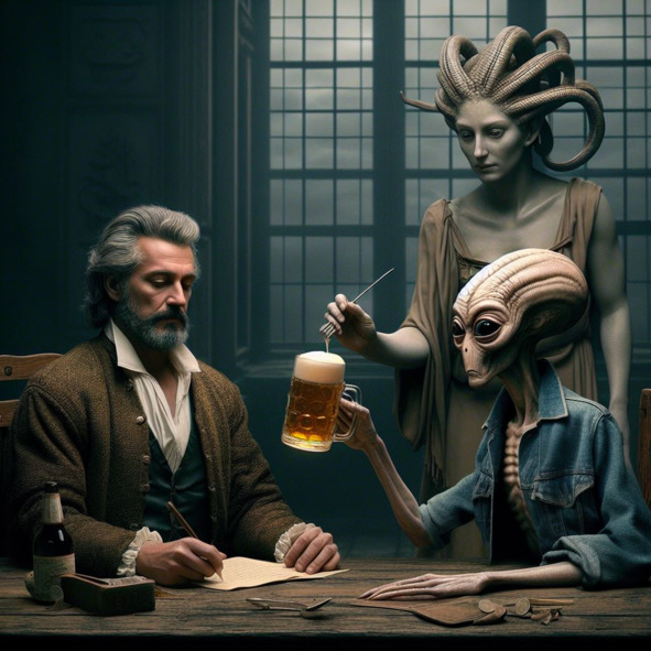 Приходит одна из горгонов и приносит ему керамическую кружку в виде пивной кружки. Бог схватил ее и жадно начал пить, как будто неделю не пил. Внезапно его опаленные глаза еще больше обливаются. Бросает стакан, поворачивается назад, начиная плевать. Горгона услужливо протягивает ему салфетку, улыбаясь многозубым ртом.