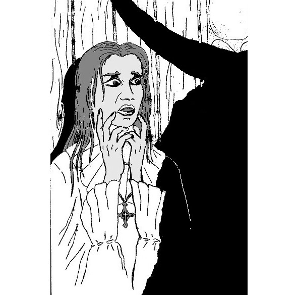 Вот из неё показалась оскалившаяся безобразная рогатая морда; вторая лапа. Так же Катрин заметила, что в зеркале нет отражения этого монстра. Лапы вытянули наружу всклоченное туловище, заднюю лапу, вторую. И вот из небольшой аптечки вылезло огромное чудовище, кое-как умещавшееся на призеркальной тумбе. Сошёл монстр на пол и направился к Катрин. Та с криком бросилась к двери, но все попытки открыть её оказались безуспешными. Женщина повернулась к монстру лицом. Бешено сердце колотилось у неё в груди. Передвигаясь на четырёх лапах, чудовище было чуть меньше человеческого роста. Дыхание Катрин участилось. Она взялась за крестик на шее и наскоро стала произносить молитвенное трёхстрочие.