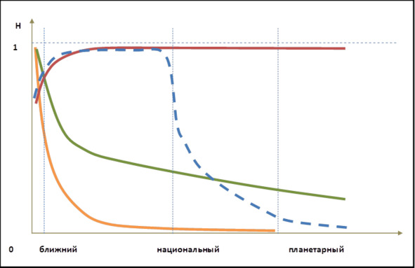 Синяя линия показывает отношение к этой проблеме патриота. В моменты исторических обострений он (например, воин) может демонстрировать несколько пренебрежительное отношение к ценности собственной жизни, но не к жизни соотечественников. В то же время ценность жизни врагов для него пренебрежимо мала. Большинство «нормальных» людей демонстрирует (в современном обществе) «зеленую позицию». В какой-то мере эти люди готовы сопереживать даже «гибели ксеноморфных [54] инопланетян».