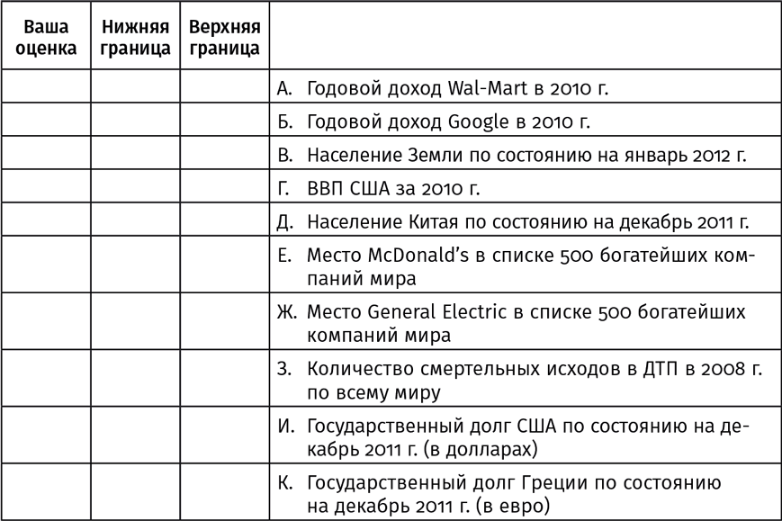 Тест, пройденный вами в начале главы, помогает выявить мнимую точность. Если вы его еще не выполняли, пожалуйста, вернитесь и заполните пустые поля.