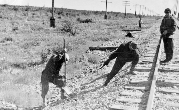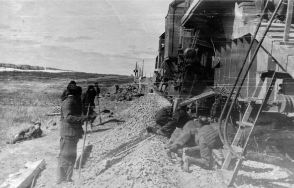 Укладка запасного пути для разъезда встречных составов: С. Грачёв, В. Бостанджиян, И.Ф.Щёголев