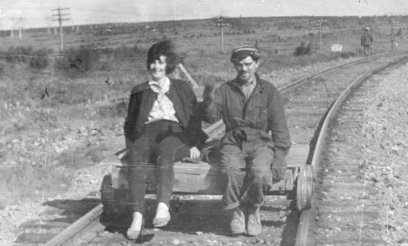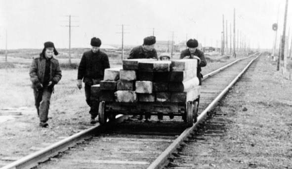 «Вагонка». Четверо в черных шапках (В. Петинов, М.Г.Шпуга, Ю. Петров, Ж. Тонков) везут, беседуя, шпалы, а пятый Вартан Бостанджиян, еле видимый, в белой шапке толкает «вагонку» что довольно тяжело