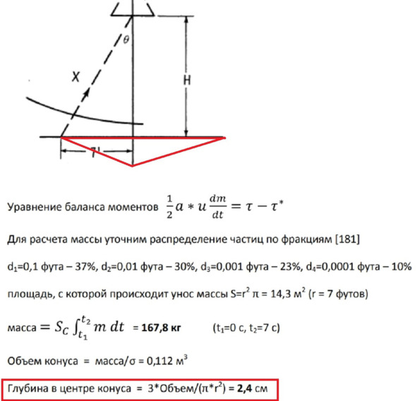 Ссылка 147 в настоящее время не открывается. Защитник НАСА почему-то решил, что след, которые образуется на рыхлой поверхности, представляет собой конус! Но это утверждение не соответствует действительности, о чем не знал сам автор опуса, и, видимо, не знали сказочники НАСА. След от работы ЖРД на рыхлом грунте представляет собой полусферу. Рыхлая почва сдвигается давлением газа не только вниз, но и в разные стороны. При этом образуется возвышение по краям полусферы. Таким образом, если рыхлый грунт находится на глубине более 7 футов, глубина полусферического кратера будет составлять эти самые 7 футов или 2,13 метра. Американский пропагандист полагает, что образование конуса на рыхлой почве не приводил к появлению возвышения почвы по краям круга-основания конуса. Защитник НАСА не учел сдвиг почвы в сторону от центра и образование возвышенности по краям круга с радиусом 7 футов. Это приводит к увеличению глубины кратера с 2-х см до 3040 см, если глубина рыхлого грунта это позволяет.