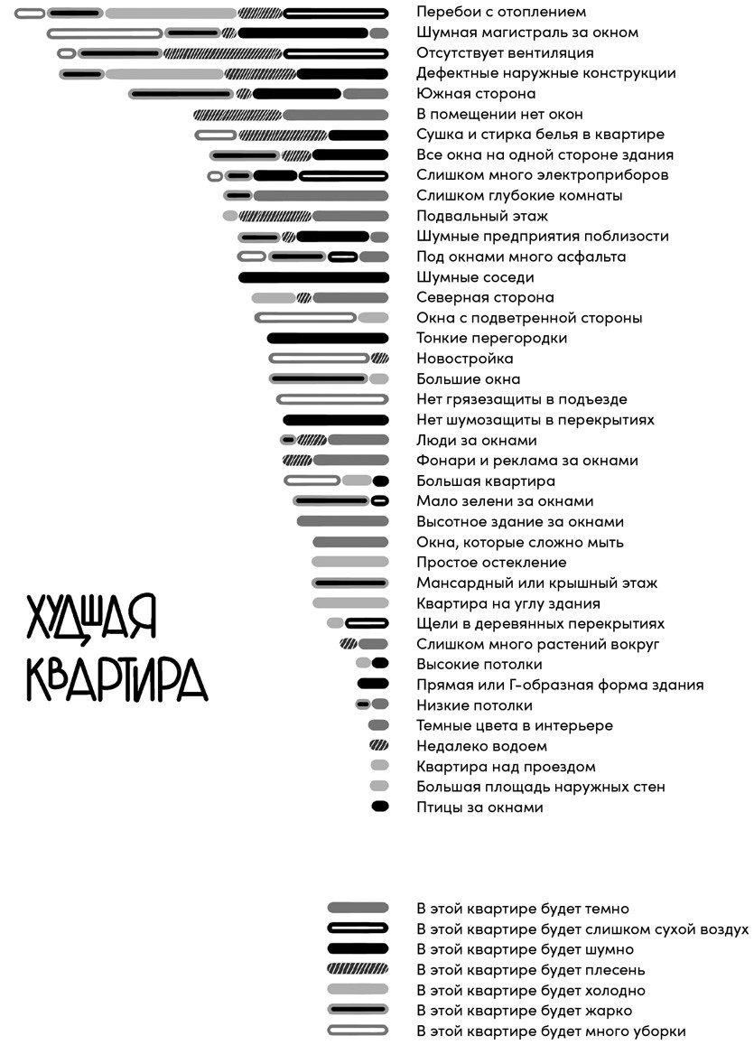 В исходном состоянии все квартиры на самом деле друг на друга похожи. У них частенько одни и те же недостатки и примерно одинаковая форма внутреннего пространства: прямоугольная. Обитатели этих параллелепипедов тоже во многом сходятся: большинство хотят шуметь и смотреть на лес из окна. Ниже я оставлю памятку, в которую стоит заглянуть перед подписанием договора покупки или аренды. Я назвала этот чек-лист «Худшая квартира» это собранный мною список самых частых проблем, о которых упоминают люди, говорящие, что их что-то в квартире раздражает. Важно тем не менее помнить, что фатальных ошибок в выборе квартиры не бывает. Даже на лестничной клетке реально обустроить покрывающие все ваши нужды апартаменты. Исключение составляют полутораметровые квартиры-гробы в Гонконге с этим я пока не знаю, что делать.
