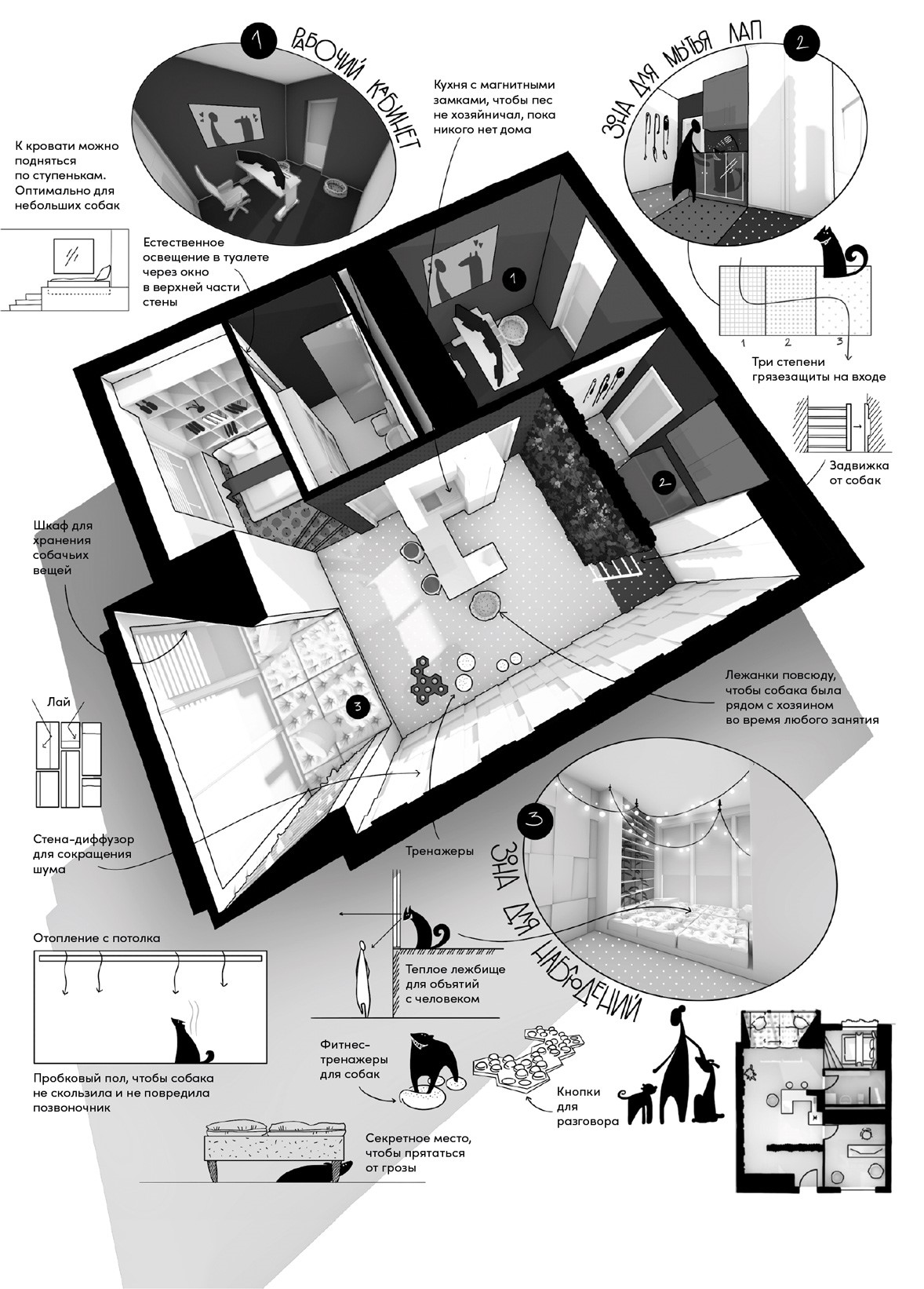 По внешнему виду квартиры можно многое понять о профессии человека, его привычках и ценностях, мечтах. Жилище, план которого показан на предыдущей странице, принадлежит фитнес-тренеру для собак. В нем есть ряд организационных приемов, ориентированных на содержание нескольких собак, до которых не каждый архитектор смог бы додуматься. Когда человек эксплуатирует пространство, в процессе он тестирует и адаптирует дизайн под реальность: где валяются вещи, по какой траектории он передвигается и почему. Он интуитивно прорабатывает все свои квартирные роли и сценарии и может даже не замечать ценности своих изобретений, однако найденные им приемы будут полезны и тем, у кого собак нет. Как избежать скользкого пола, например, или проводов под ногами, было бы полезно знать, если, например, у вас в квартире маленькие дети или пожилой человек с больными ногами. Если для обычного человека это способ достижения комфорта, то для собачника вопросы выживания обитателей квартиры. Так что я и вам предлагаю изучить все свои домашние сценарии и роли, позаимствовав, если нужно, приемы у тех, чьи истории я расскажу позже.