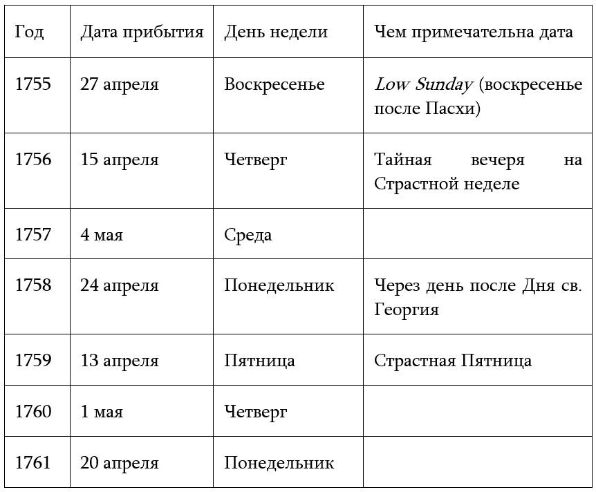 Большинство исследователей Писания сходятся в том, что казнь Христа случилась вблизи еврейского праздника Песах, предположительного 14-го или 15-го числа32 лунного месяца Нисана, в полнолуние.33 Вечер прибытия на остров в 1756-м 15-го апреля; в этот день заканчивается полнолуние, которое началось утром 14-го.