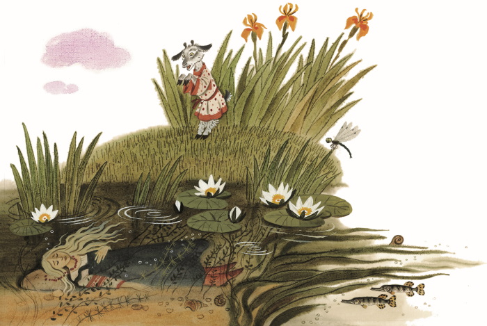 Зовёт Алёнушка братца, а вместо Иванушки бежит за ней беленький козлёночек.