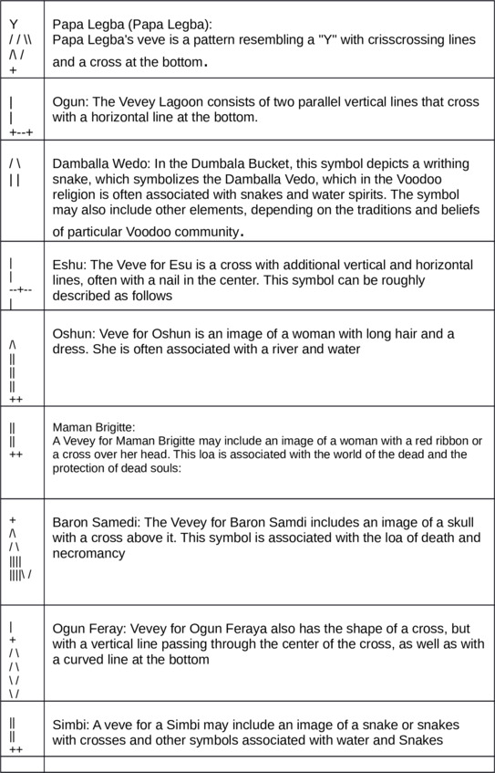 Lets take a closer look at some of the signs and instruments in more detail. So, Veves are symbolic drawings that are associated with various loa (spirits or gods) in the Voodoo religion. Each Loa has its own unique veve, which is used to invoke and address it during rituals and ceremonies. Below are examples of veves for some of the most famous Loa (gods) in Voodoo and their brief description: